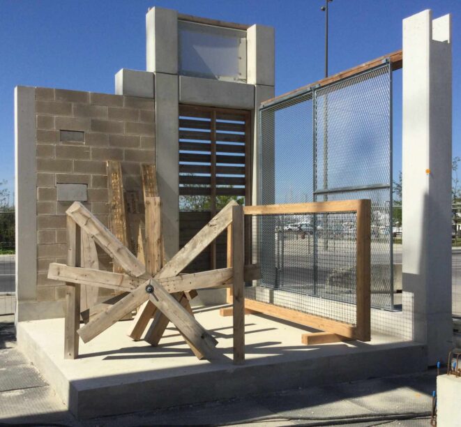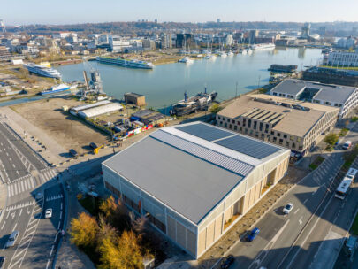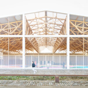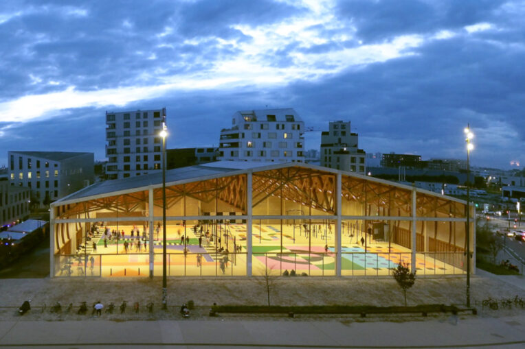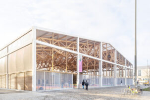 REEMPLOI | Ce projet ambitieux en termes de réemploi de bois structurel (près de 500 éléments de charpente bois) et de bardage bois (lames de terrasse employées en claustra bois).
