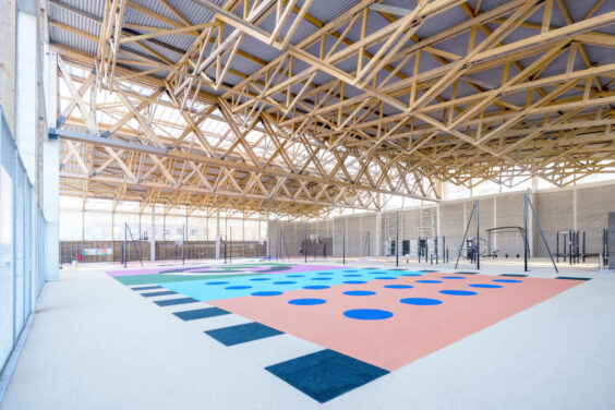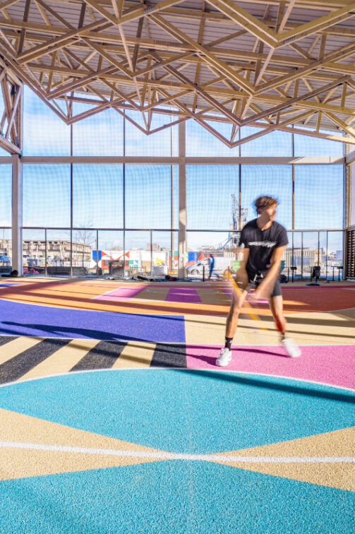 Le préau accueille trois aires sportives permettant une pratique sportive libre et gratuite, ouverte à tous et toutes. Non-genrées, elles facilitent l’accès au sport pour les femmes dans un lieu public.