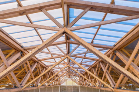 La charpente en bois massif, telle une topographie inversée, un paysage flottant constitue un événement dans l’espace public. Dense, composée d’éléments moisés qui dégagent le sol de tout impact structurel, elle assume son hétérogénéité de teintes qui révèle le parti-pris de ses essences multiples : bois neufs locaux et bois de réemploi issus de chantiers de déconstruction de la métropole bordelaise.