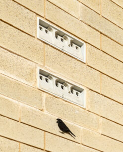 Un mur en « parpaings d’argile », blocs creux à base de ciment d’argile non calcinée locale, confère au préau une intimité et atténue les nuisances acoustiques de la circulation routière.